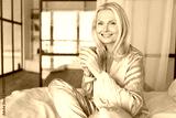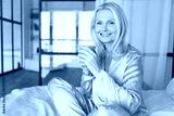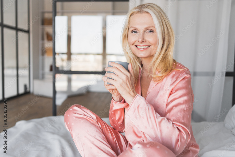 Middle aged blonde woman in pink pastel sleepwear pajamas with cup of coffee tea hot beverage sitting in bed looking at camera. Enjoying morning every day of life. Cozy light living room interior