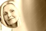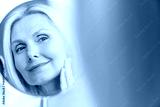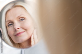 Beauty, reflection and mirror with aged woman in bathroom for morning routine, makeup grooming. Self care cosmetics foundation glow with mature person in home for cosmetology, shine hygiene