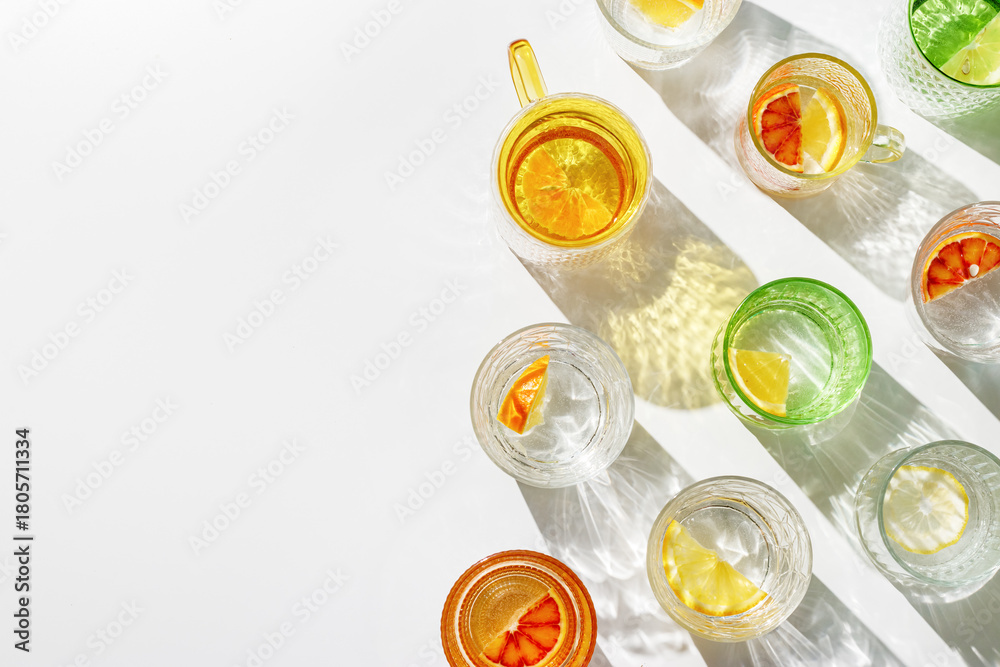 Summer still life with colored glass cups of infused water with slices of fruit on white table. Glittering different glasses at sunlight. Long harsh shadow. Summer vacation concept, top view