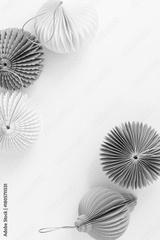 Paper Christmas Ornaments neutral pastel color, hanging New Year decorations as round balls, flashlights, Christmas baubles. Minimal aesthetic holidays pattern, festive top view beige monochrome