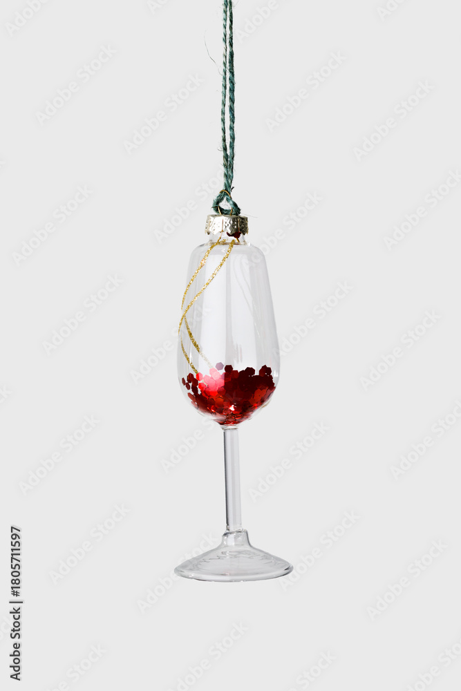 Minimal creative aesthetic view of Glass of red wine Christmas decoration hanging on grey. New Year bright glass decor as wineglass. Festive minimal concept of celebration, party and winter holidays.