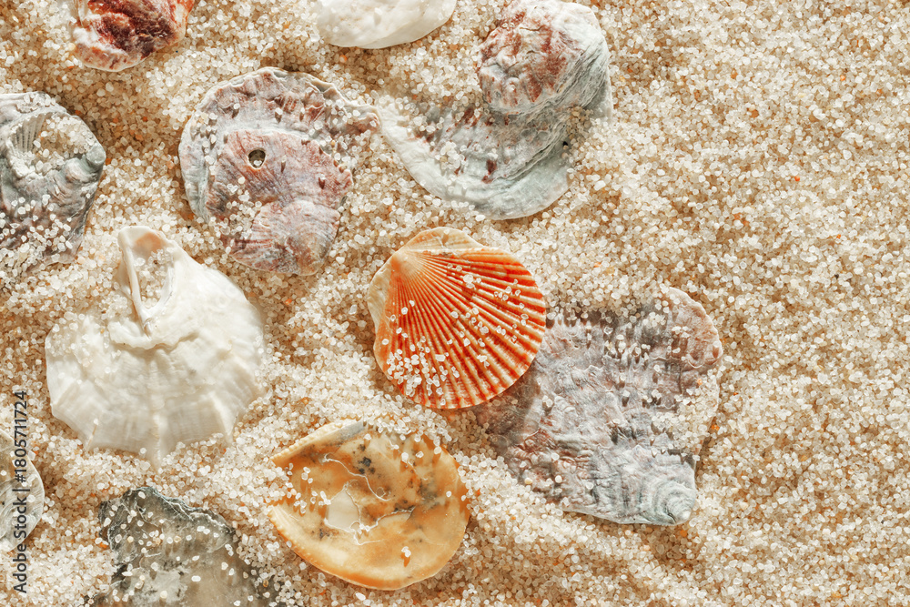 Colored Shells summer pattern on sandy beach, aesthetic nature still life, organic shapes, beauty nature background. Closeup seashells at Soft lighting, warm tones create natural, beachy mood