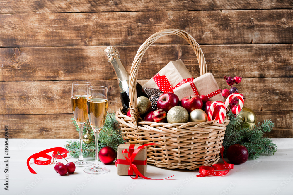 Two glasses of champagne with christmas basket with bottle, gifts with red satin ribbon, candy canes, pine cones, golden garlands on dark brown wooden background, new year celebration concept