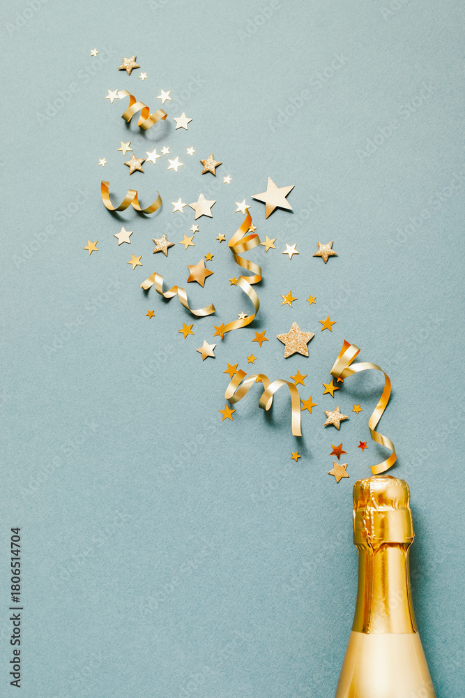 Party, New Year or birthday festive background with golden champagne bottle and confetti stars. Trendy blue template for holiday celebration top view.