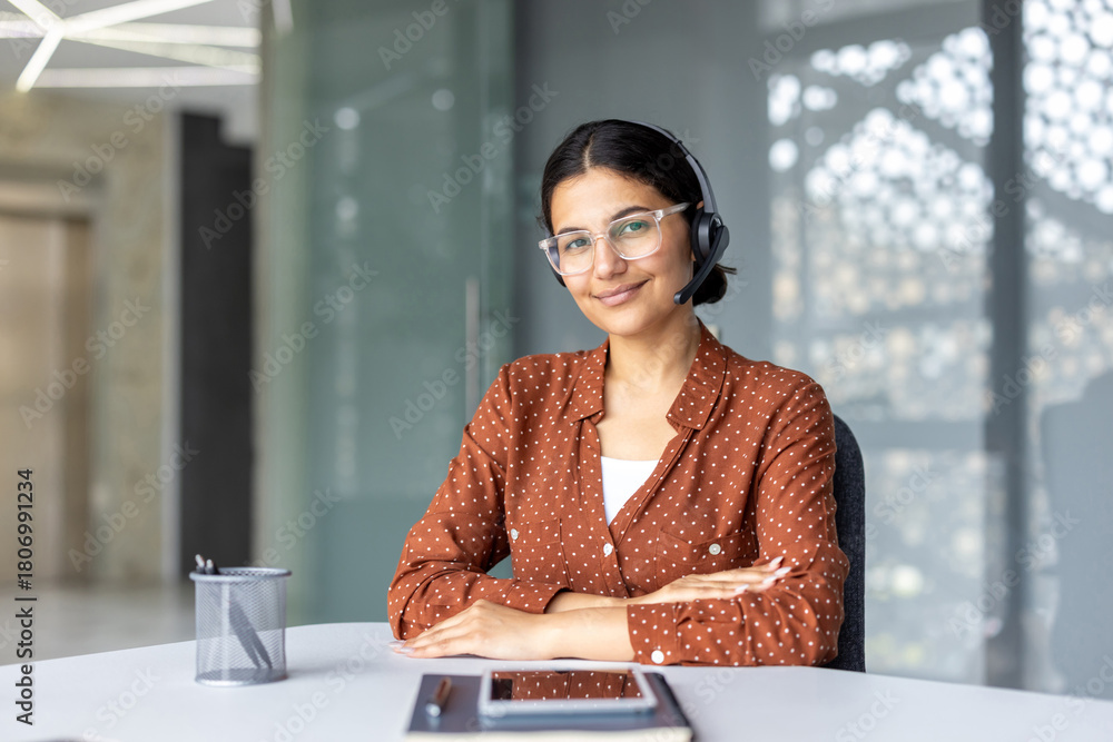 Young professional woman providing diligent customer support, working at a modern call center desk while wearing a headset and looking directly at the viewer