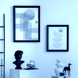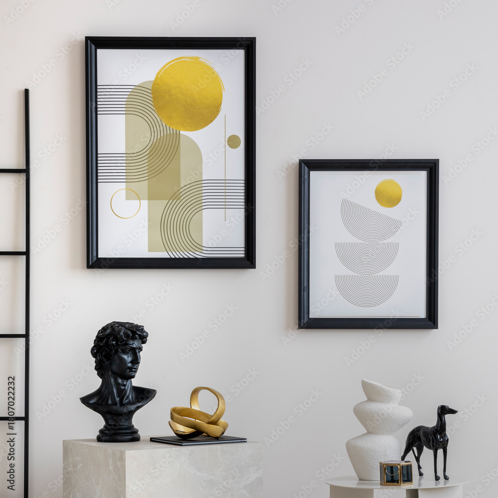 Creative composition of harmonized living room with mock up poster frames, shelf, ladder, decoration and personal accessories. Minimalist home decor. Template.