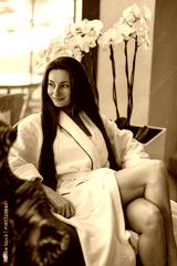Beautiful young caucasian woman in white bath robe feeling contented and pleased