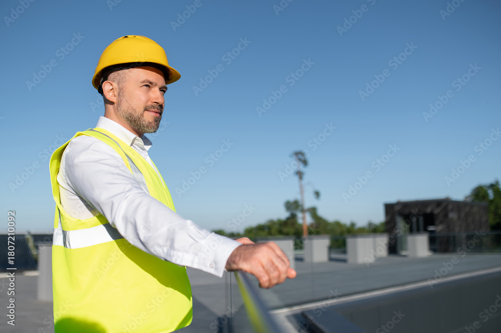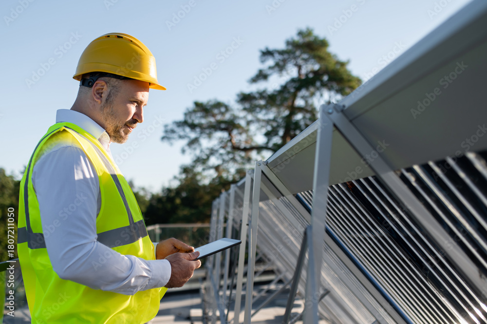 Technician male worker checking solar power system using tablet computer