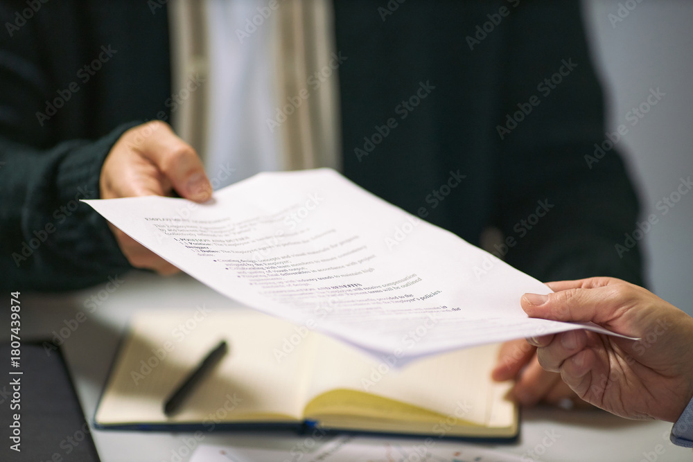 Caucasian middle aged man handing business document to Caucasian middle aged woman during meeting, both sitting at desk with open notebook, focusing on exchanging paperwork