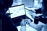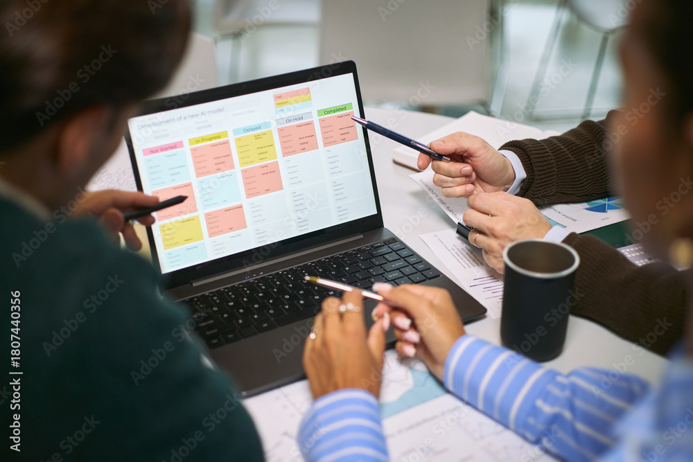Multiethnic group of young adult women collaborating around laptop, discussing business strategy, pointing at digital project management board, working in modern office setting