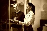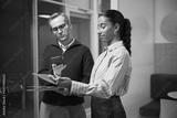 Caucasian young adult man and Black young adult woman discussing business documents and using smartphone in modern office setting, both standing and collaborating on project