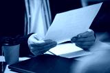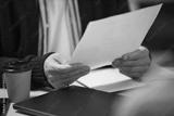 Caucasian middle aged man holding documents and reviewing paperwork at desk with disposable coffee cup and closed laptop visible, business context suggesting office environment