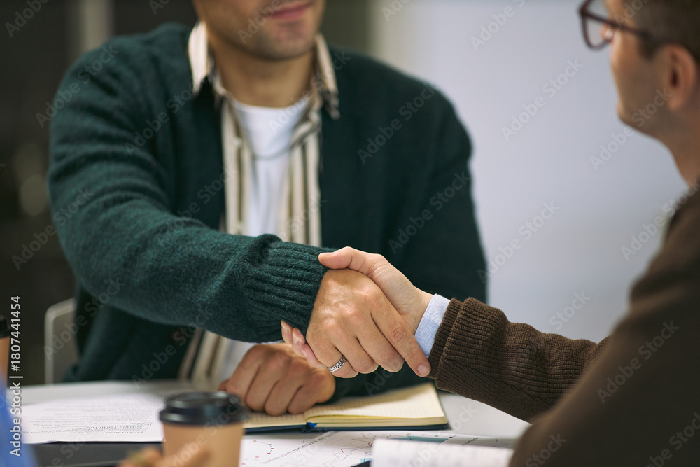 Caucasian young adult man and Caucasian middle aged man shaking hands during business meeting, both sitting at table with documents and coffee cups, focusing on handshake gesture