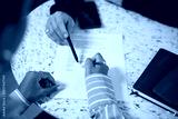 Caucasian woman and Black woman discussing business contract at round table, both reviewing printed document with pen and smartphone visible, focusing on agreement details