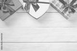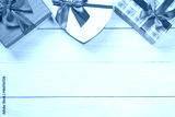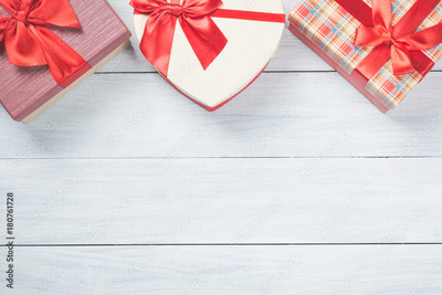 Valentine day or Christmas concept. Colorful gift boxes on nice white wooden background with space for your text