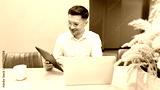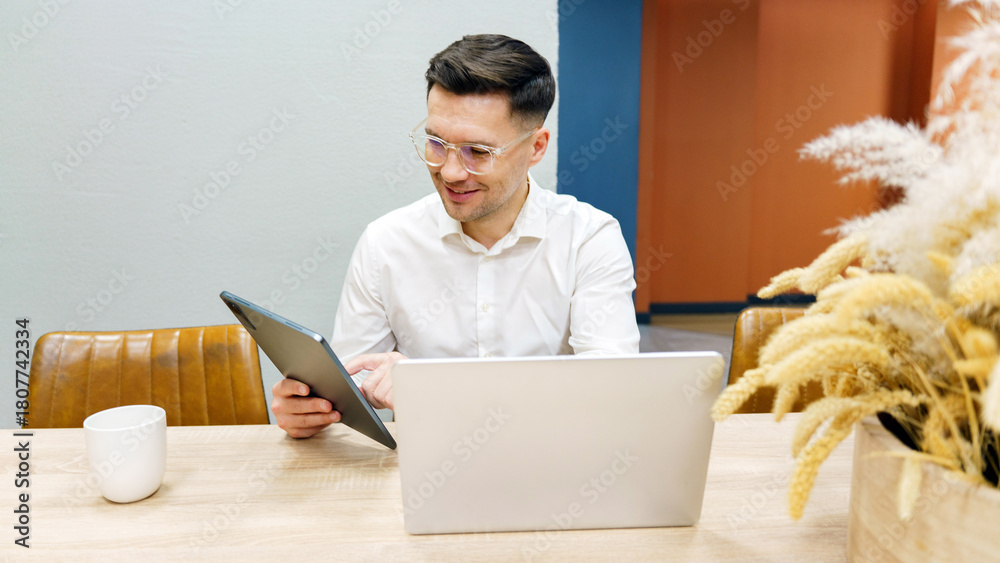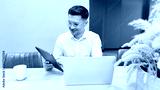 Man working on a tablet while sitting at a desk