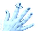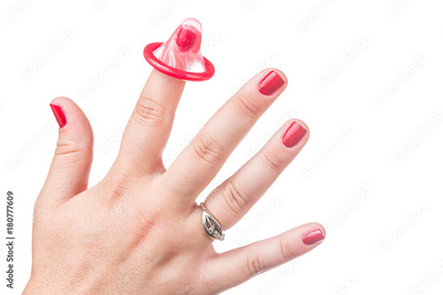 Healthcare concept and safe sex. Red condom on womans finger with red nails isolated on white.