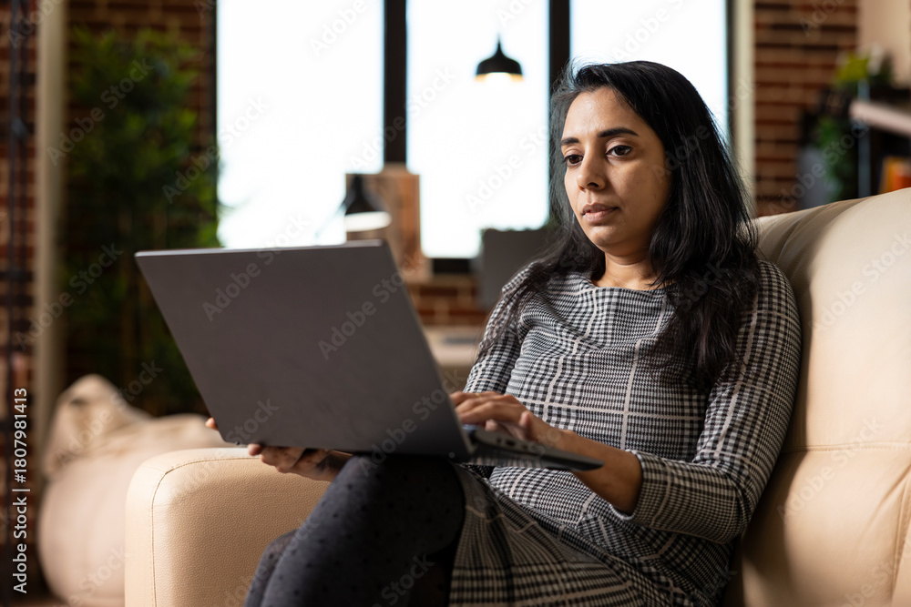 Modern Indian woman seated on couch, focused on editing blog post and researching business trends. Female entrepreneur working remotely with laptop, reviews marketing plans in cozy home environment.