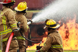 Firefighters spraying foam water to control extinguish an intense blaze.