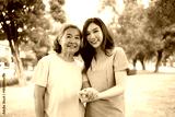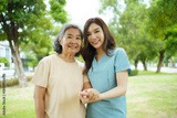Caregiver assisting elderly Asian woman during a walk in the garden.