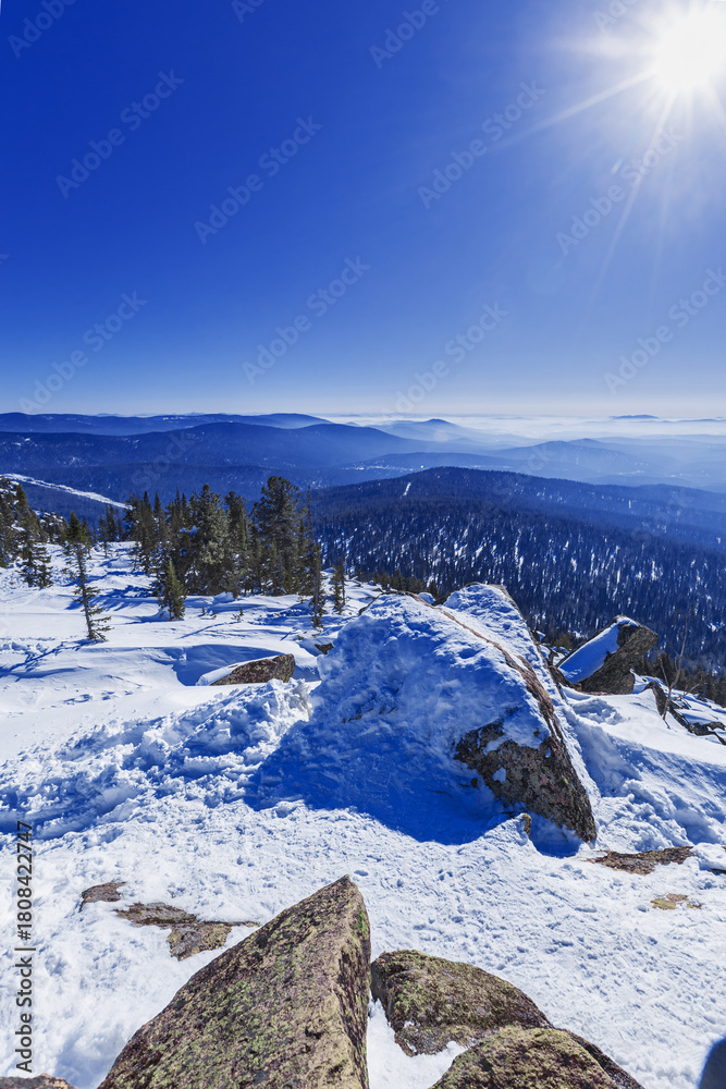 Panoramic view of mountain ridges in fog and sky in Sheregesh, Russia. Beauty white blue peaks Altay mountains fades in distance. Snow conifer forest and stones at bright winter sun on mount Ytuya.