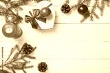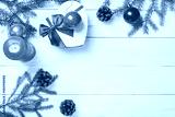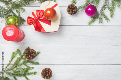 Christmas or new year frame for your project with copy space. Christmas fir trees in with cones, red burning candle,heart shaped gift-box with red ribbon and christmas balls on a white wooden board.