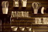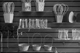 Assorted empty flower baskets, heart shaped boxes, and clear plastic vases arranged on transparent shelves against striped wall, floral packaging supplies organized for display
