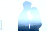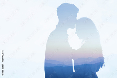 double exposure of couple in love, affectionate man and woman, dating, silhouettes on white background