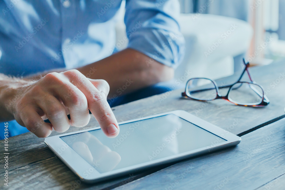 man reading emails and news on social media, close up of hands using digital tablet computer, banking online