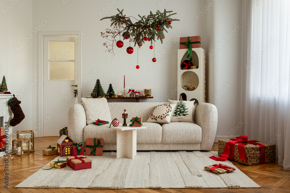 Cozy Christmas living room with decorative trees, candles, gifts, and festive pillows on a textured white sofa.