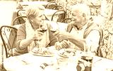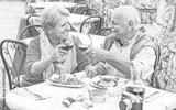 Retirement senior couple drinking and eating in restaurant outdoor - Mature Husband and wife having fun in romantic vacation- Love and joyful elderly lifestyle concept - Warm contrast filter