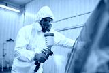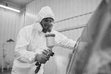 An auto painter dressed in full protective gear is spray-painting a car inside a white garage