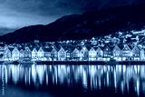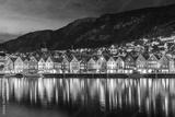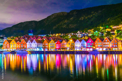 Night view of a historical wooden district Bryggen in the norwegian city Bergen.
