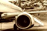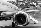 Commercial airplane parked on runway, showcasing detailed engine design and sleek fuselage, with residential buildings on hillside in the background, highlighting aviation technology