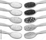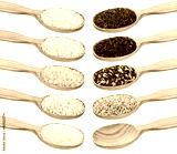 Rice collection. Different types of rice in wooden spoons isolated on white background