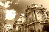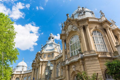 Historical building in Budapest - Vajdahunyad Castle facade over the blue sky in main City Park Varosliget.