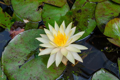 water lily, lotus with white petals and yellow center