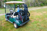 Golf car on green lawn of golf course