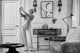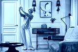 Caucasian senior woman smiling while taking selfie with smartphone standing in modern living room, holding phone at arm's length, enjoying moment, casual home environment