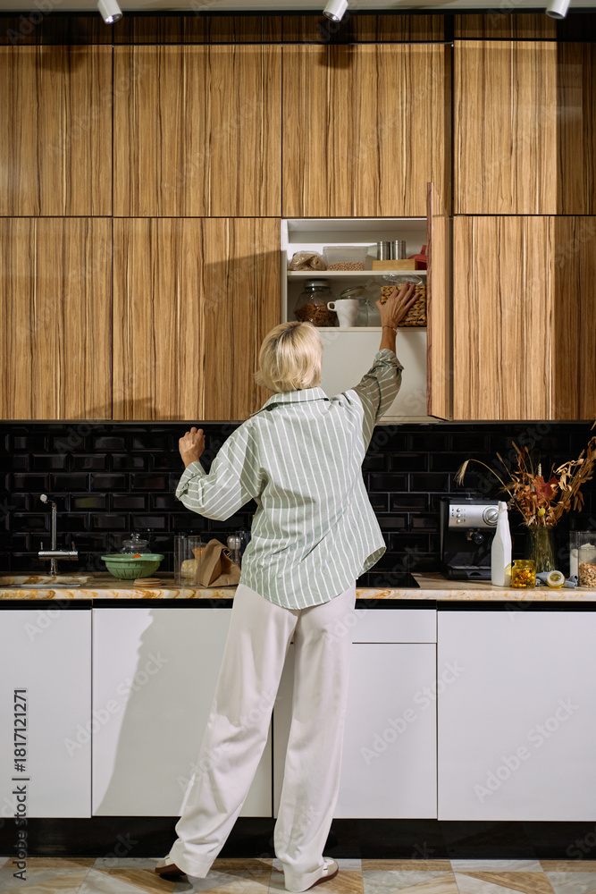 Senior Caucasian woman reaching into kitchen cabinet standing in modern kitchen, back view visible, performing daily household task, hair short and light, casual clothing
