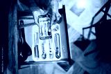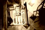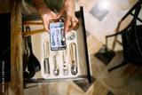 Caucasian young adult woman holding smartphone above open kitchen drawer, photographing organized cutlery tray with various utensils, hands and phone visible from overhead perspective
