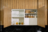 Kitchen cabinet standing open revealing shelves with glassware, jars labeled with pantry staples, woven basket, spices and containers, modern wood and black tile background
