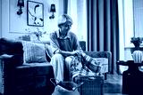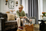 Middle aged Caucasian woman sitting on sofa folding plaid blanket into wicker basket, arranging household items in living room with decorative elements and flowers visible in background