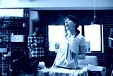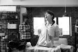 White woman singing out loud while ironing clothes with steaming iron in living room. Happy female adult multitasks during laundry day, performing with joy as boyfriend stands with phone in background