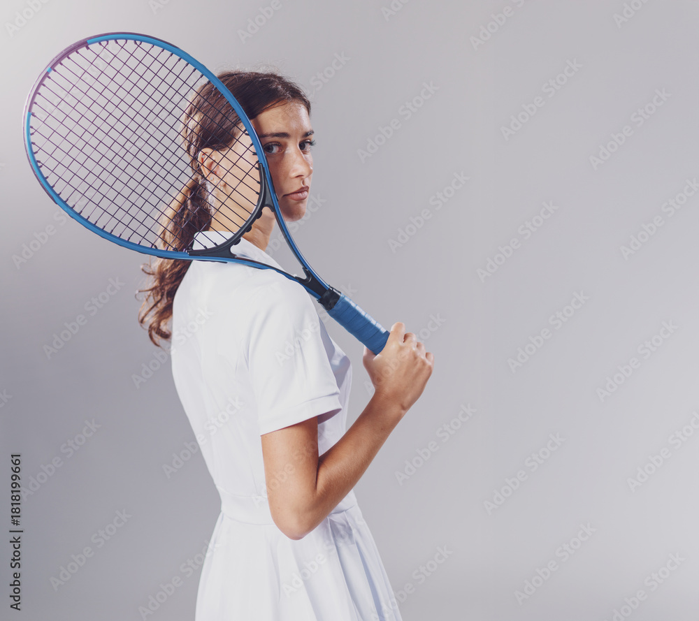 Beautiful Young Brunette Tennis Player Posing with Racquet on Gray Background