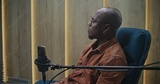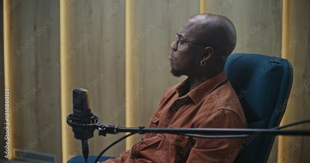 Close Up of Bald, Black Expert Speaker With Glasses and Earring, Positioned Professional Microphone in Modern Audio Studio. Concept of Professionalism of Digital Broadcasting and Thought Leadership.