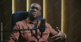 Positive Male Speaker in Professional Audio Studio, Speaking Into Microphone With Confident and Open Expression. Concept of Expert Commentary and Clarity in Modern Media Production. Portrait.