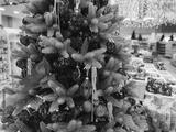 A Vibrant Christmas Tree Decorated with Red and Black Ornaments Amidst a Festive Store Setting Full of Holiday Cheer