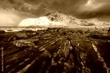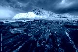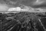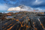 Rocky winter coastline with orange seaweed on dark stones, waves hitting the shore and a snow-covered mountain. Arctic landscape with rocks, stones, sea, dramatic cloudy sky. Lofoten Islands, Norway