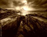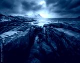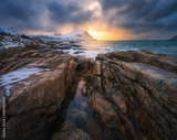 Rock pools and coastal stones , winter mountains and cold sea water. Arctic landscape with snowy rocks, sea, waves, dramatic cloudy sky at sunset. Travel on Lofoten Islands, Norway. Nature. Seascape